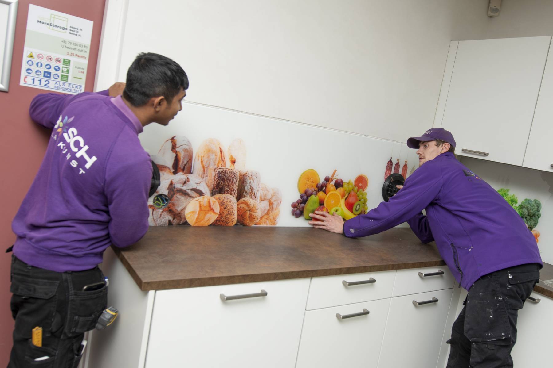 MoreStorage had voor haar bedrijfskantine een frisse, hygiënische en praktische oplossing nodig. Samen zijn we tot een mooi ontwerp gekomen en hebben we de keuken van de bedrijfskantine voorzien van een glazen keuken achterwand.