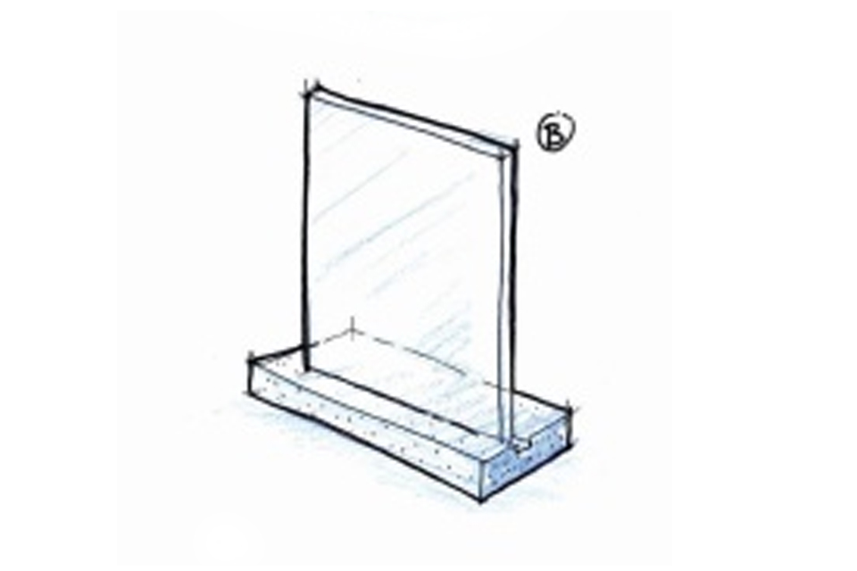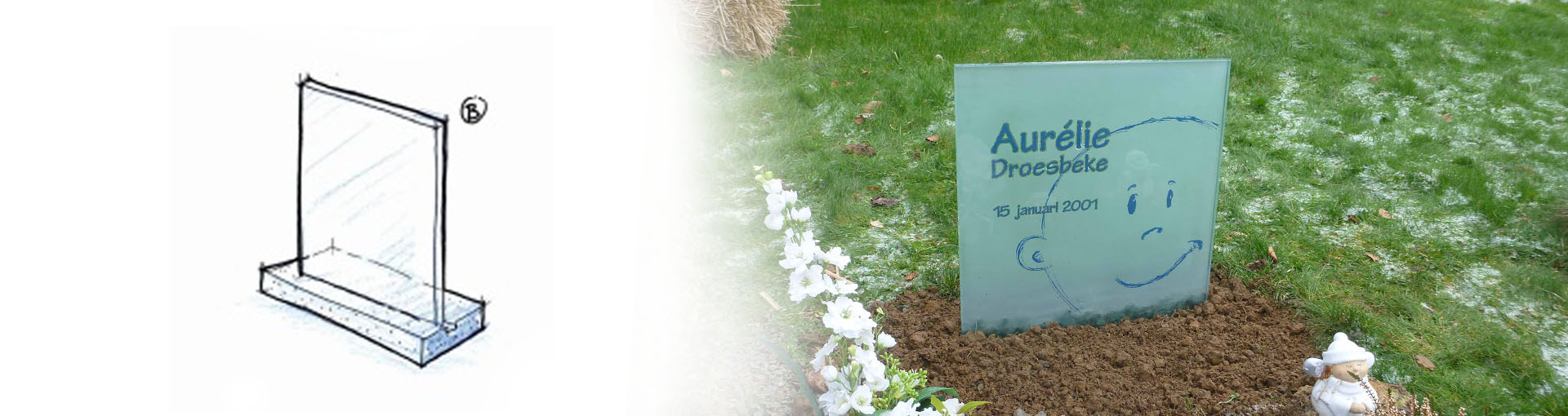 Glazen grafmonument basismodel B is een staand model geplaatst in een speciaal daarvoor ontworpen betonnen fundering. De fundering wordt geplaatst onder de grond en is dus niet zichtbaar. Hierdoor is het mogelijk om direct om het staande glazen gedenkteken planten of grind te plaatsen. De tekst in het glazen grafmonument is diep gestraald, daardoor krijgen de letters een extra diepte werking.