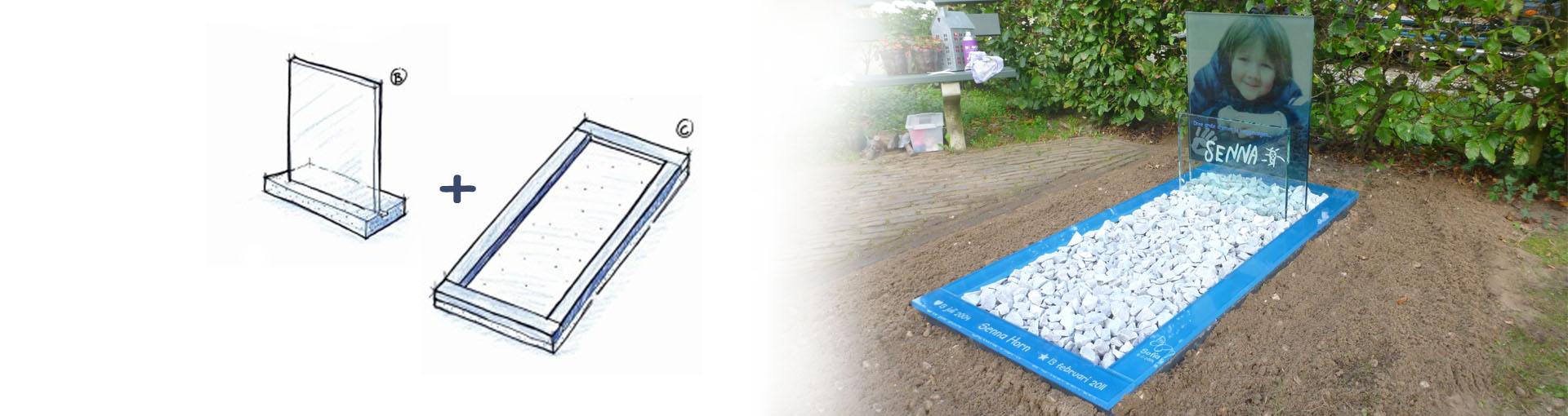 Glazen grafmonument basismodel D is uitgevoerd met een granieten omranding waar in het midden een staande grafzerk zoals basismodel B geplaatst is. Deze staande grafzerk is geplaatst op dezelfde fundering als waar de omranding uit graniet of marmer op verlijmd is. U heeft de mogelijkheid om direct om het staande glazen gedenkteken planten of grind te plaatsen. De tekst in het glazen grafmonument is diep gestraald, daardoor krijgen de letters een extra diepte werking.